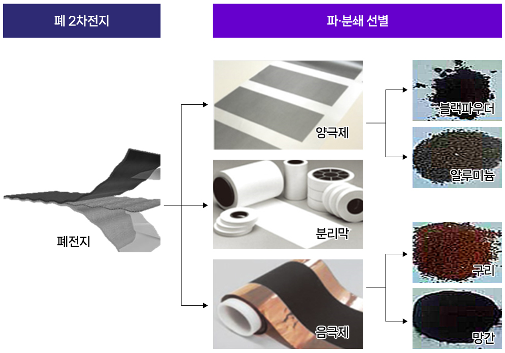 자력 선별을 이용한 철분 성분을 제거 후, 풍력선별을 통해 플라스틱류 성분 제거 와전류를 이용한 구리, 알루미늄, 스텐 성분을 제거 색채선별을 이용하여 비중및 자력선별이 어려운 물질들을 분리하여 비철금속을 포함한 양극제 음금제 회수